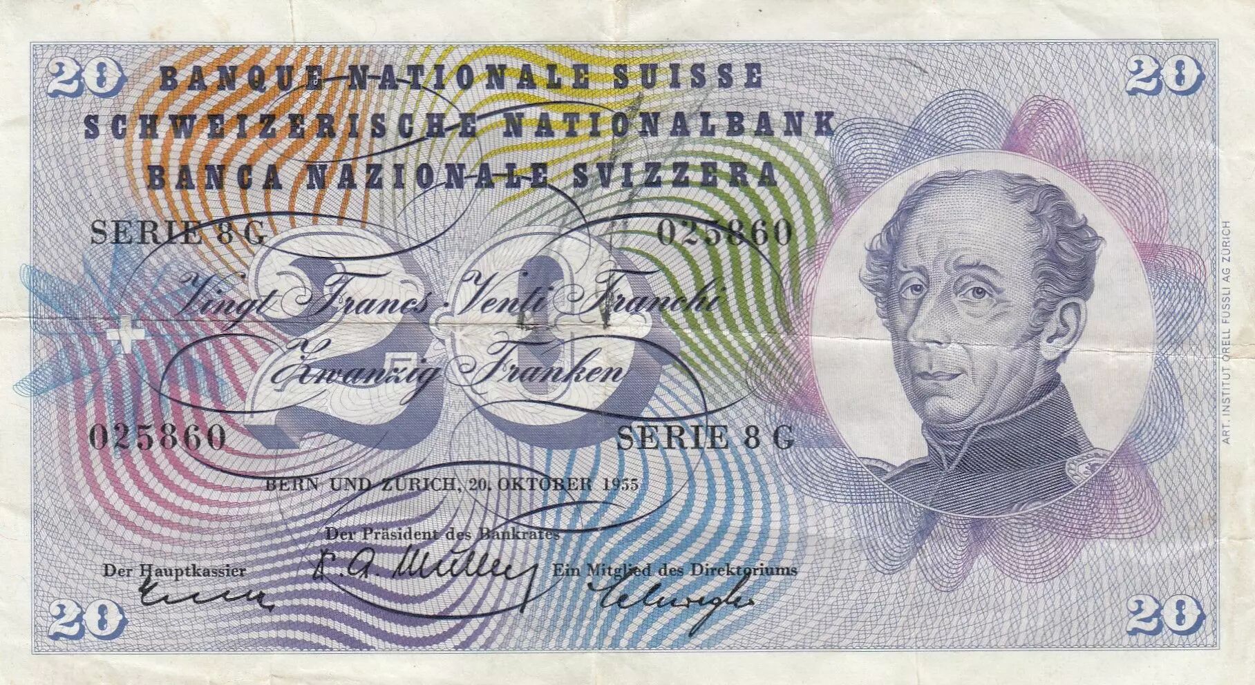 Accueil > Billets du Monde > Billets d'Europe > Suisse - Cantons Suisse > Suisse > Suisse 20 Francs - Guillaume-Henri Dufour - Chardon argenté - 20-10-1955 - Série 8G