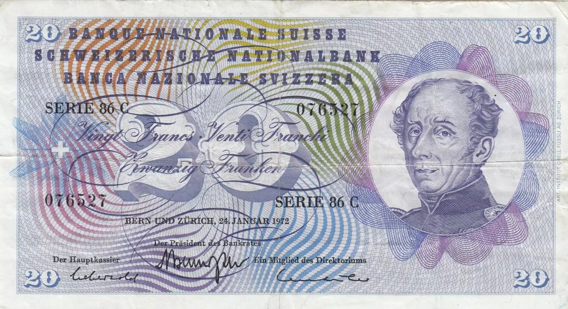 Accueil > Billets du Monde > Billets d'Europe > Suisse - Cantons Suisse > Suisse > Suisse 20 Francs - Guillaume-Henri Dufour - Chardon argenté - 24-01-1972 - Série 86C