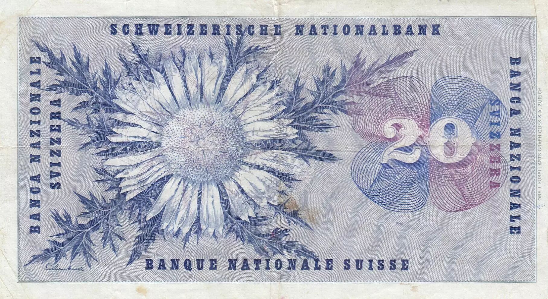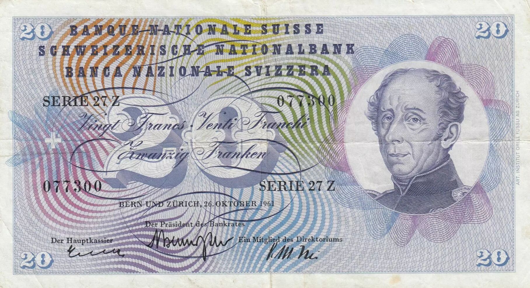 Accueil > Billets du Monde > Billets d'Europe > Suisse - Cantons Suisse > Suisse > Suisse 20 Francs - Guillaume-Henri Dufour - Chardon argenté - 26-10-1961 - Série 27Z