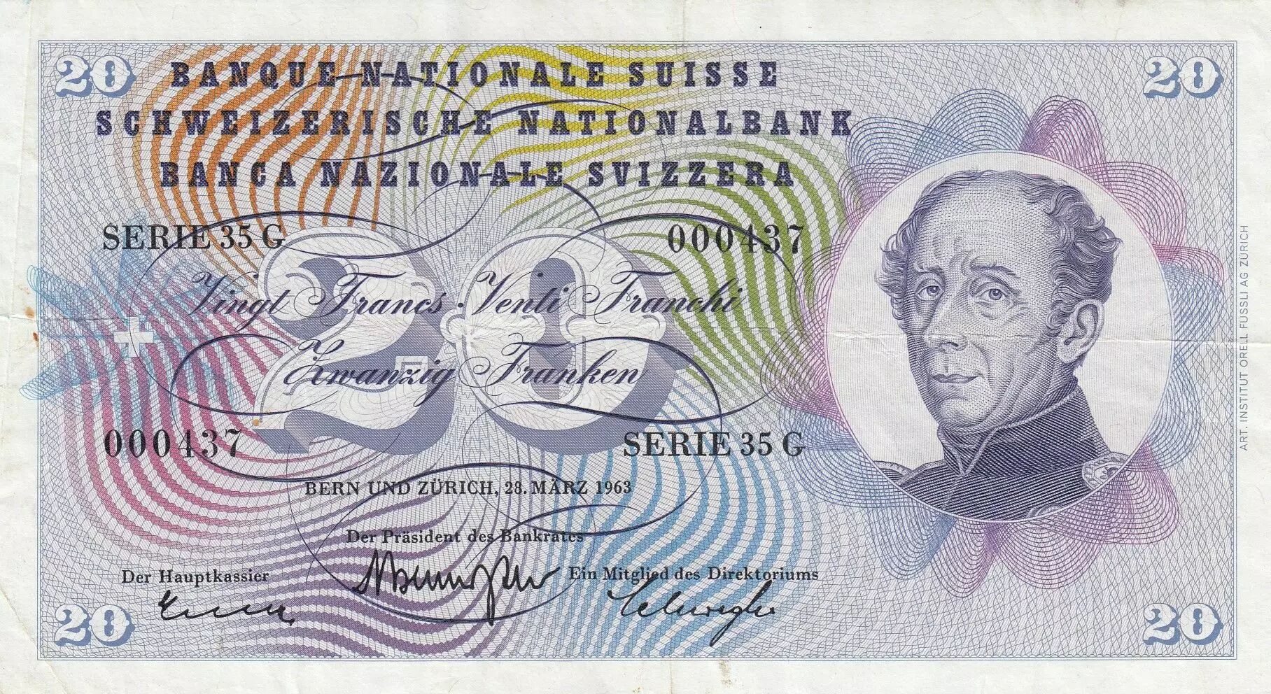 Accueil > Billets du Monde > Billets d'Europe > Suisse - Cantons Suisse > Suisse > Suisse 20 Francs - Guillaume-Henri Dufour - Chardon argenté - 28-03-1963 - Série 35G
