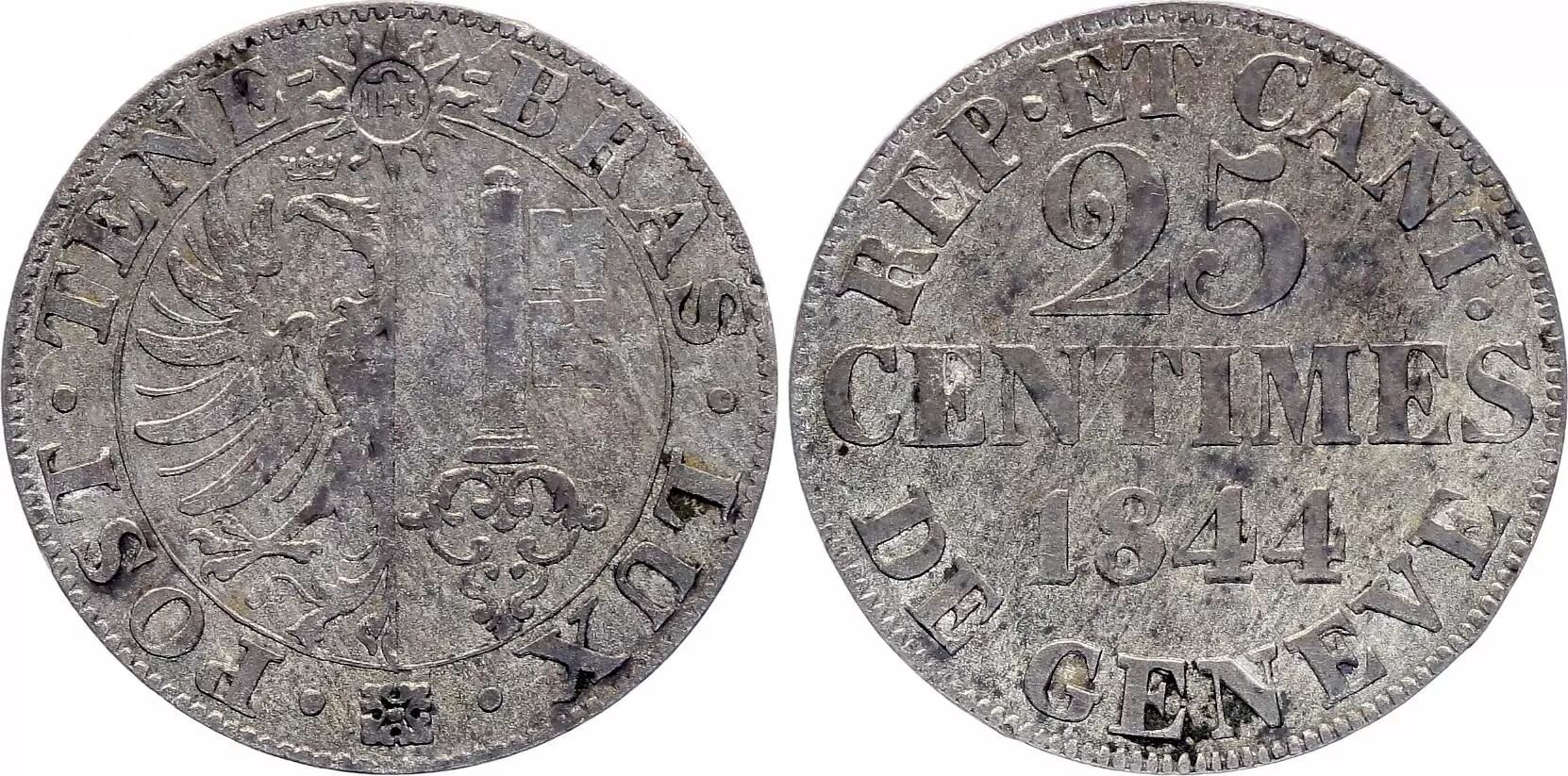 Pièce Suisse 25 Centimes, Canton de Genève - 1844