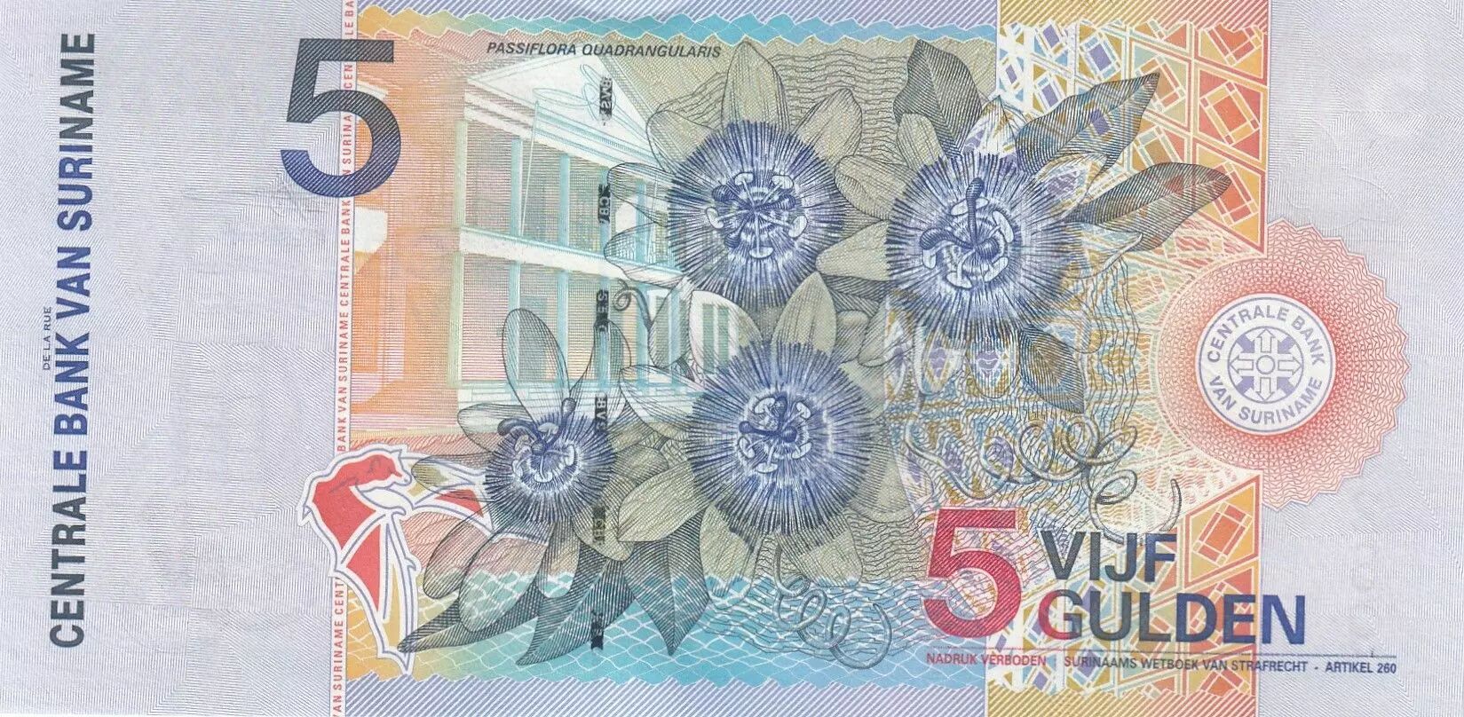 Ce billet de banque est émis par le Suriname et possède une valeur nominale de cinq gulden. Il date du 1er janvier 2000 et appartient à la série AL.