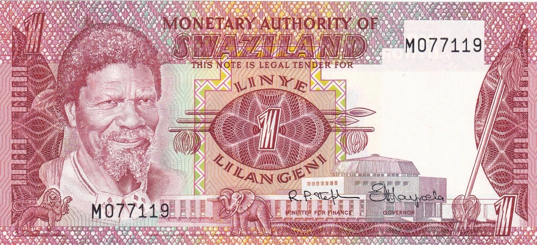 Ce billet de banque est une coupure de 1 Lilangeni émise par le Swaziland en 1974, faisant partie de la série M. Il représente le Roi Sobhuza II et les princesses du roi Sobhuza.