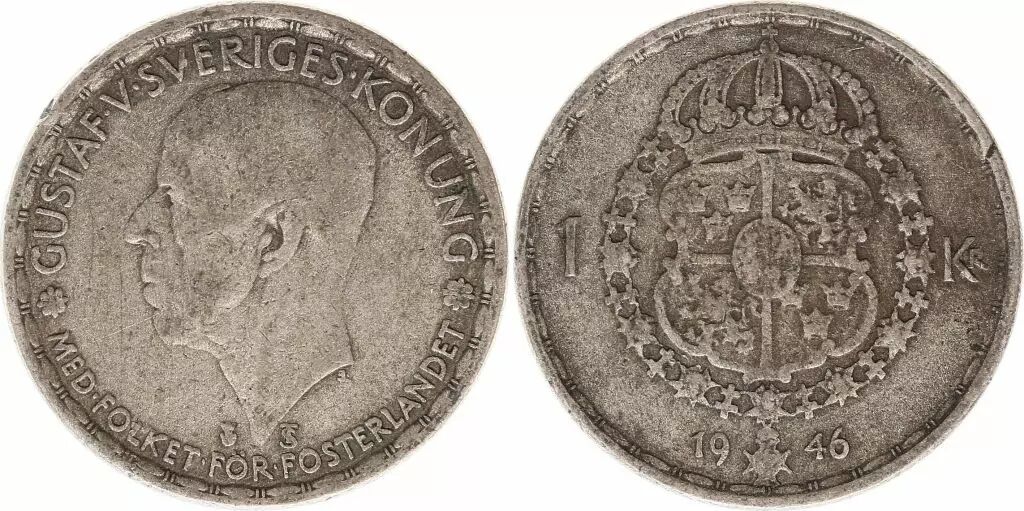 Home > > Sweden 1 Krona 1946TS - Coat of arms, Gustaf V - Silver