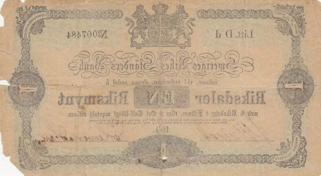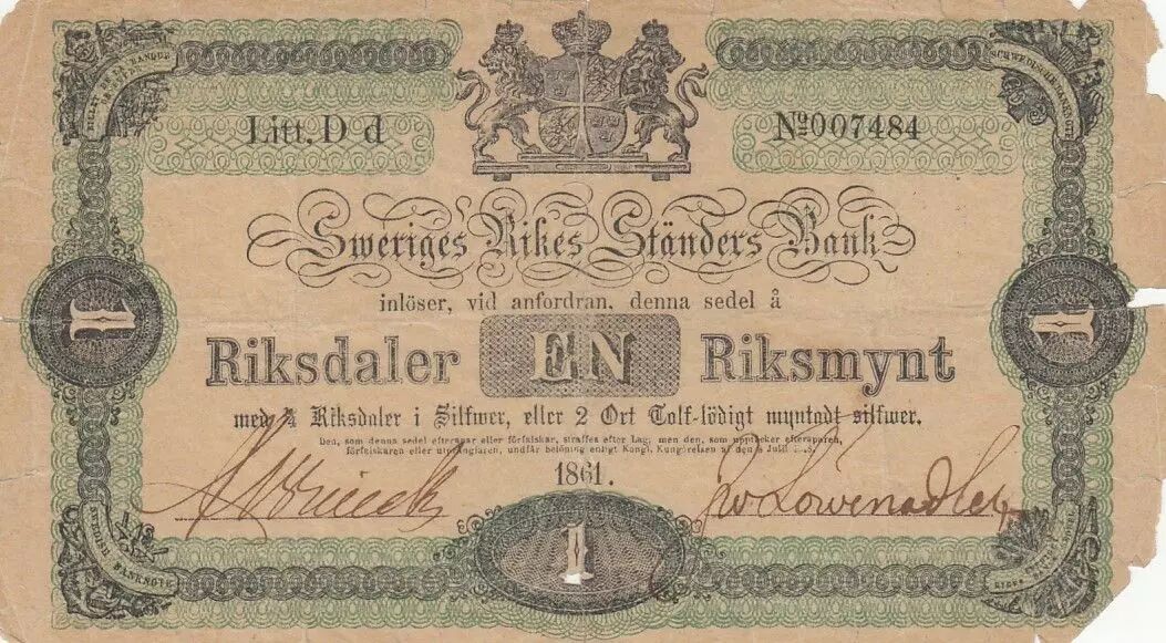 Banknote Sweden 1 Riksdaler Riksmynt - Arms - 1861