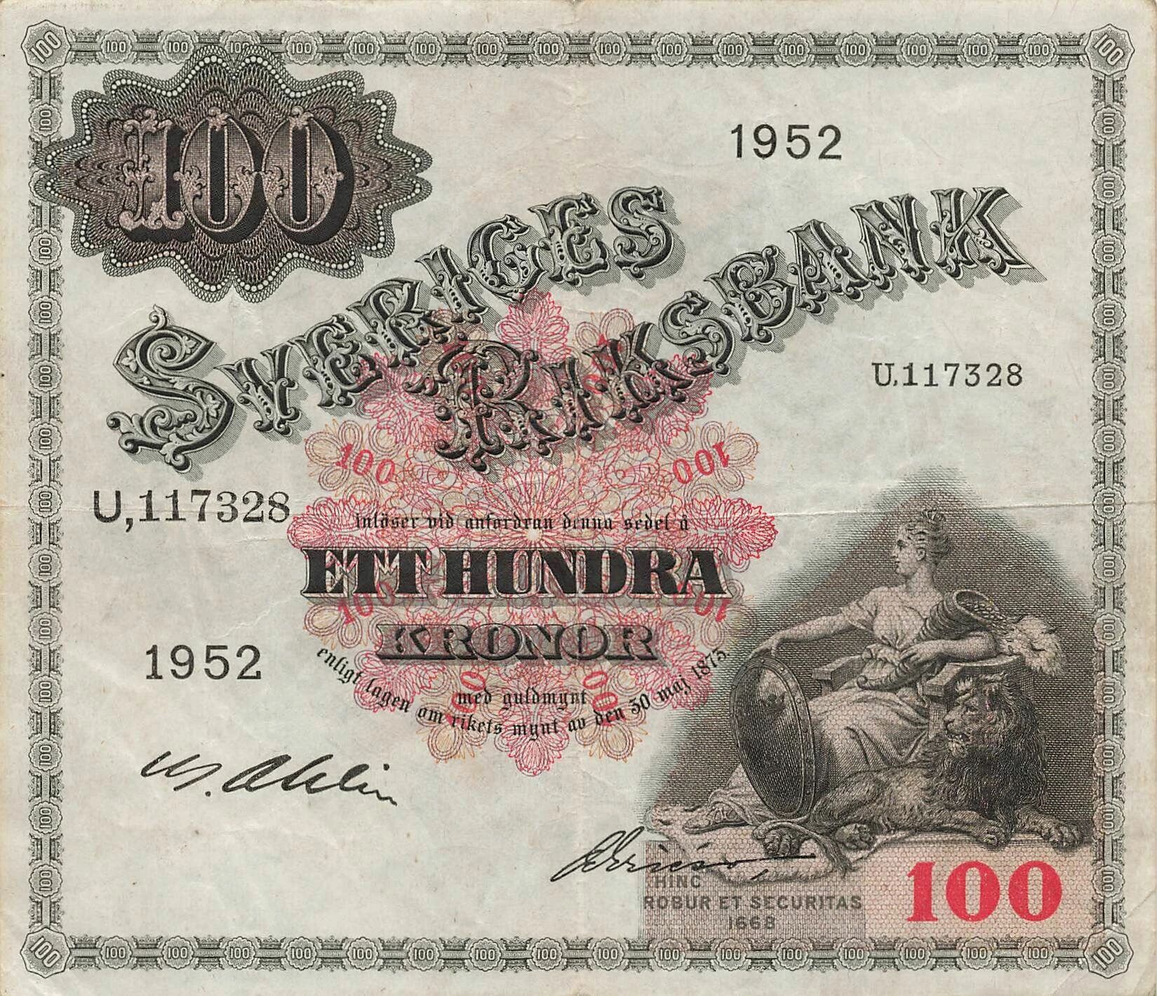Home > World Banknotes > European Banknotes > Sweden > Sweden 100 Kronor - Mother Svea - 1952 - P.36