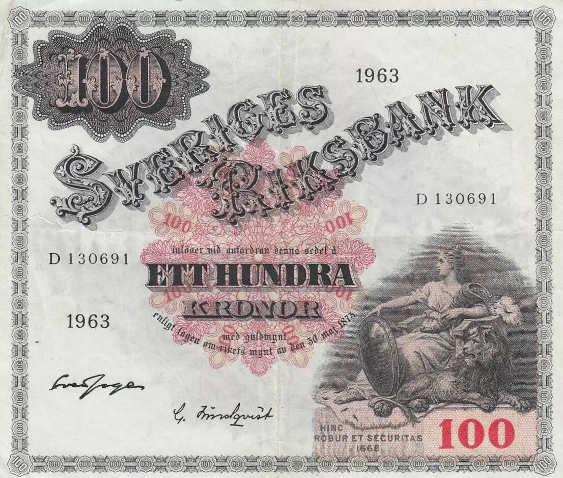 Banknote Sweden 100 Kronor - Svea - Gustav Vasa - 1963 - Serial D - P.48e