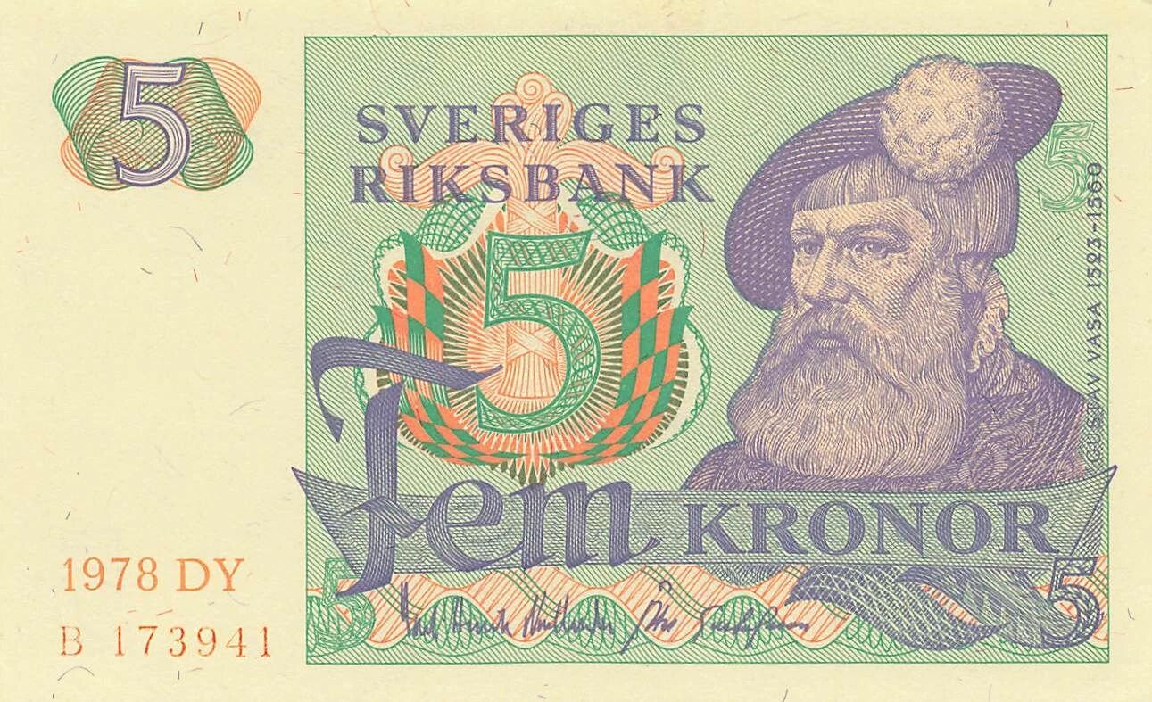 Home > World Banknotes > European Banknotes > Sweden > Sweden 5 Kronor - Gustav Vasa - 1978 - P.51