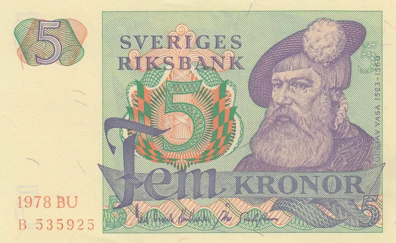 This banknote is issued by Sweden, with a nominal value of five kronor. It dates from 1978 and belongs to Series B 535.