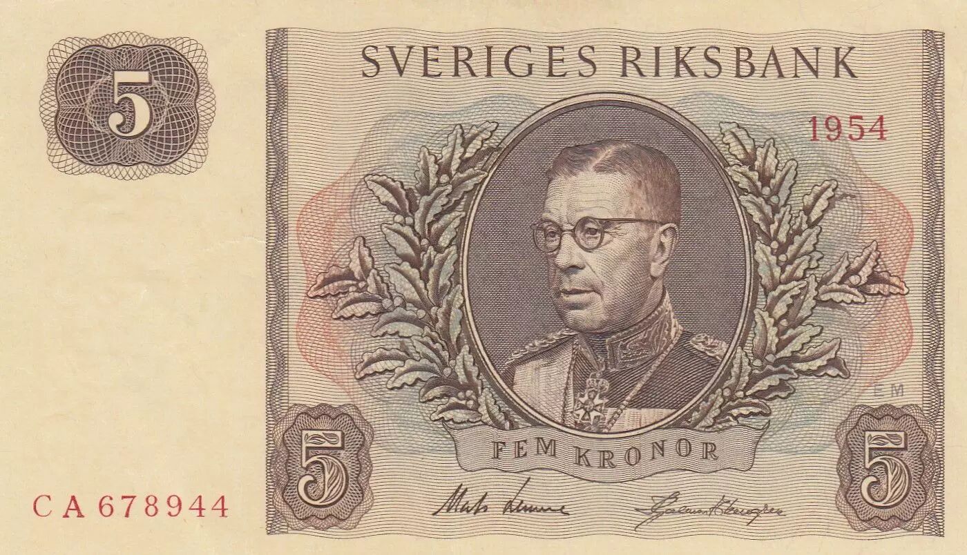The obverse of the banknote is mainly adorned with the portrait of King Gustaf VI Adolf, the year of issue (1954) and the unique serial number assigned to each banknote. The inscription "Sveriges Riksbank" attests to the issuing authority, while the face value "Fem Kronor" is displayed in full and in numerals. The reverse features Svea, an emblematic figure of Sweden, bearing the national coat of arms and the value figure. A subtle watermark, also representing King Gustaf VI Adolf, is incorporated into the paper to enhance the security of the banknote.