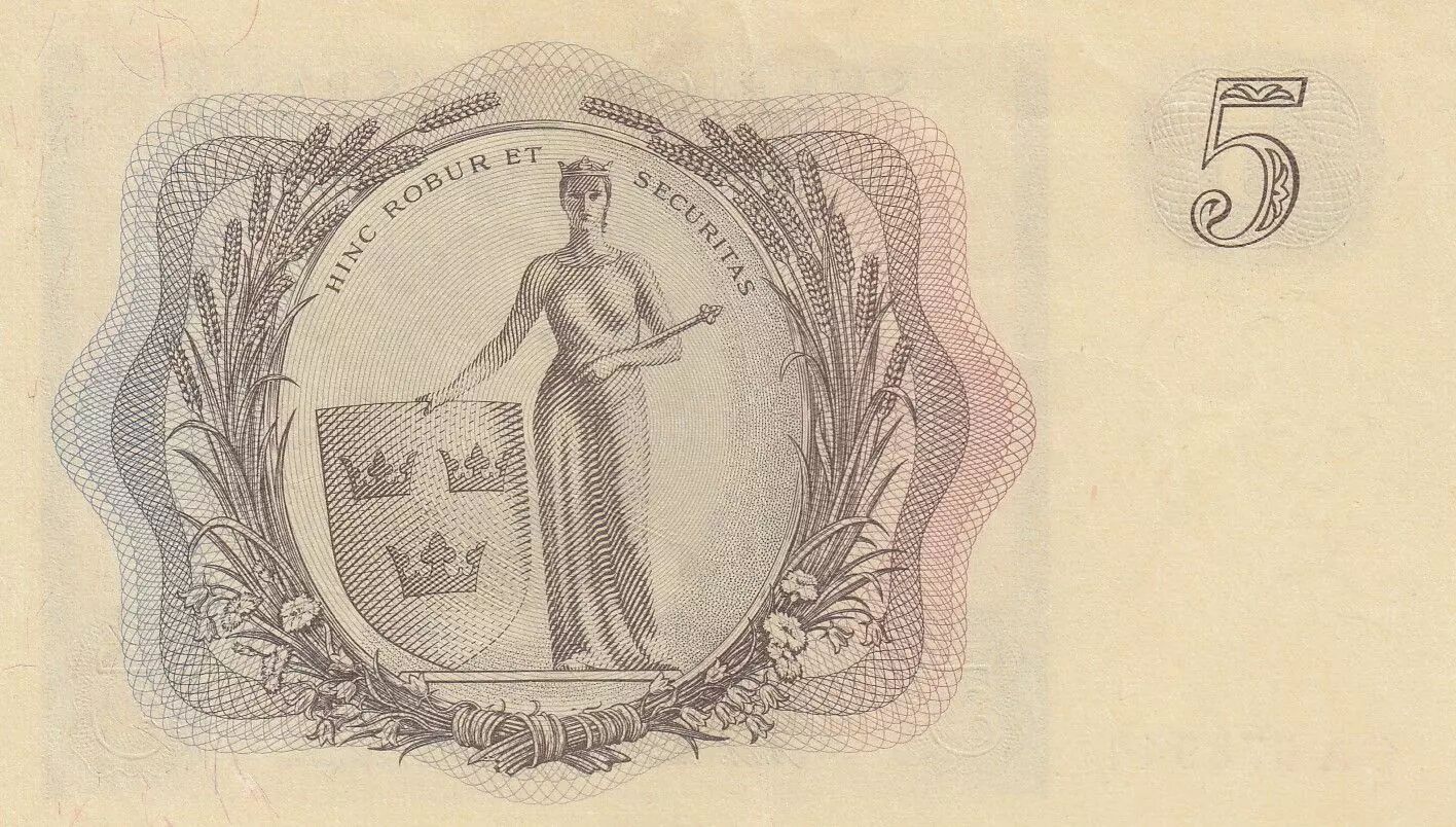 The reverse of the banknote features a representation of Svea, the national allegory of Sweden, bearing the country's coat of arms. The value figure is also present on this side. The watermark integrated into the paper represents the portrait of King Gustaf VI Adolf, adding a security measure against counterfeiting.