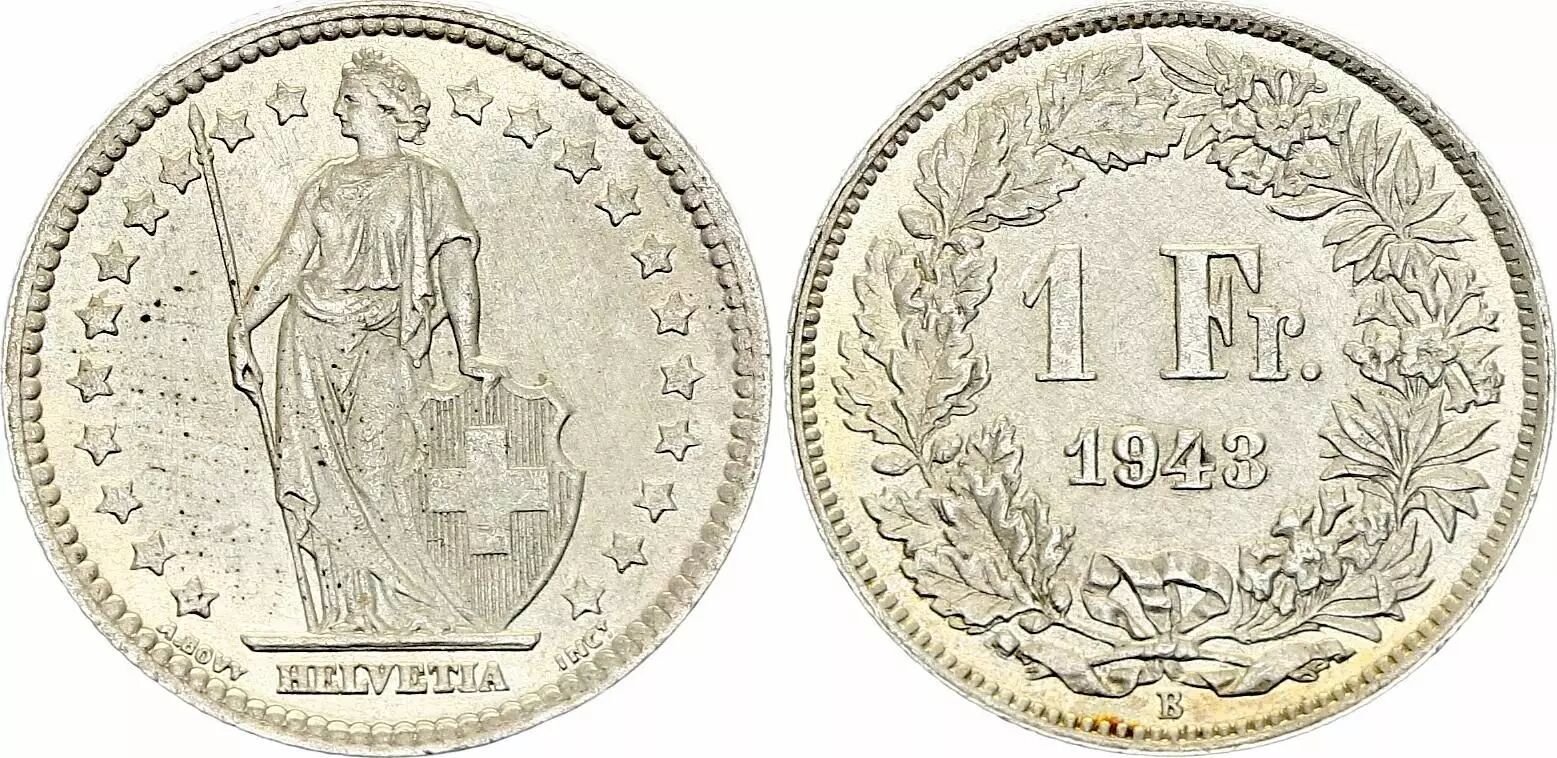 Coin Switzerland 1 Franc Helvetia - 1943 - B Bern - Silver