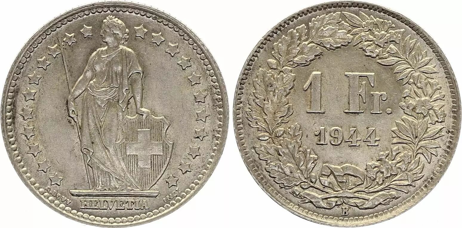 Coin Switzerland 1 Franc Helvetia - 1944 - B Bern - Silver