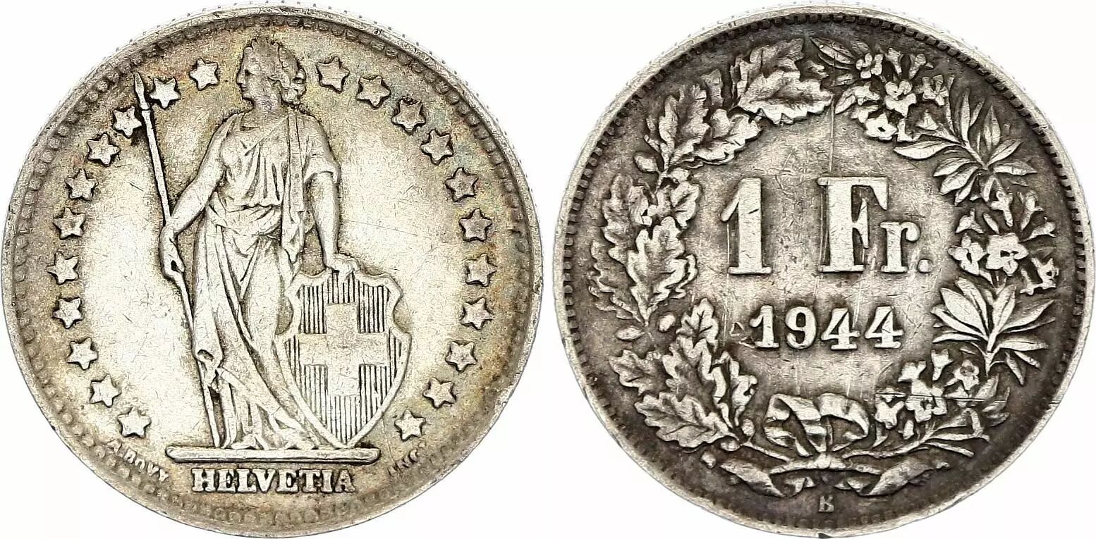 Coin Switzerland 1 Franc Helvetia - 1944 - B Bern - Silver