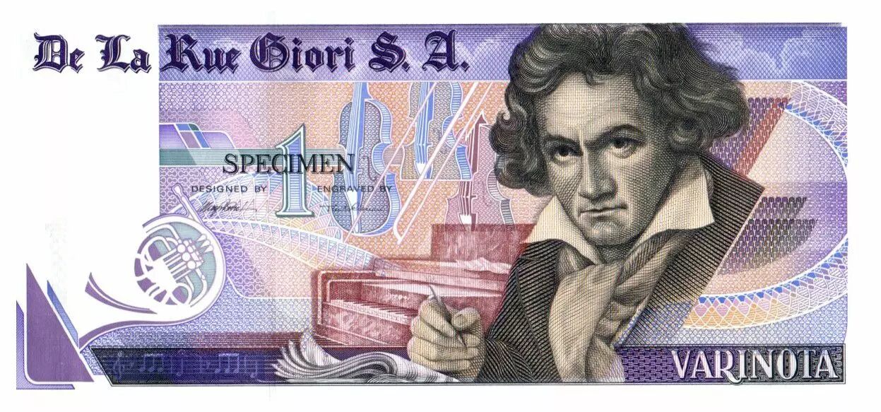 Home > World Banknotes > European Banknotes > Switzerland - Swiss Cantons > Switzerland > Switzerland 1 Varinota, Test Note - De la Rue Giori - Beethoven - No Serial