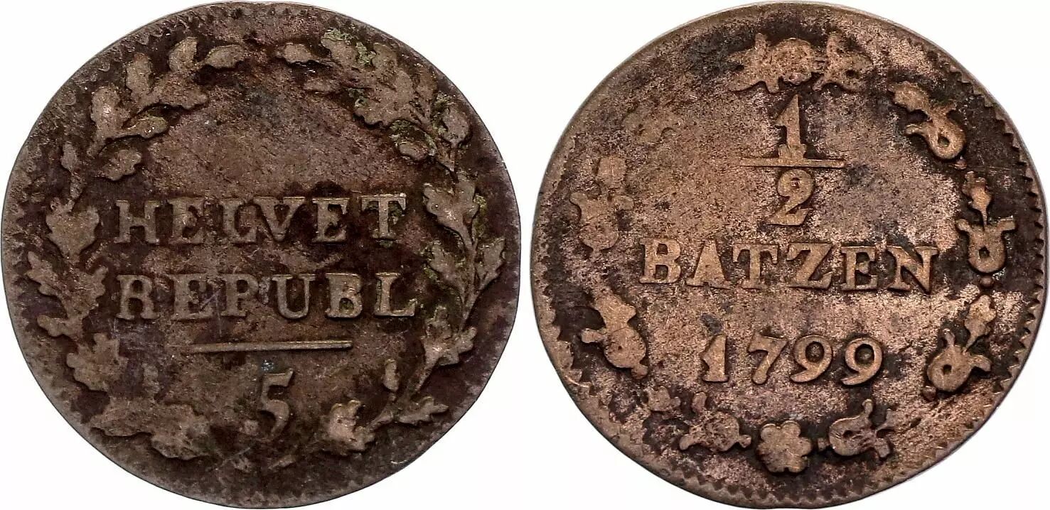 Home > > Switzerland 1/2 Batzen - Helvetic Republic - 1799