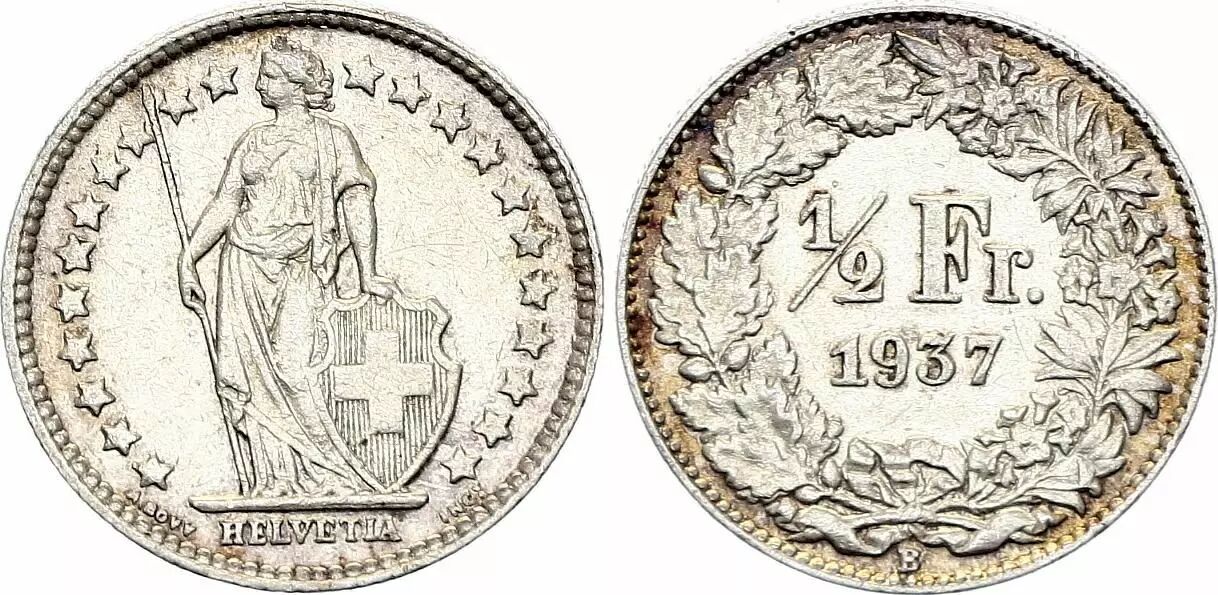 Coin Switzerland 1/2 Franc Helvetia - 1937 - B Bern - Silver