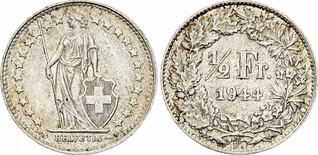 Coin Switzerland 1/2 Franc Helvetia - 1944 - B Bern - Silver