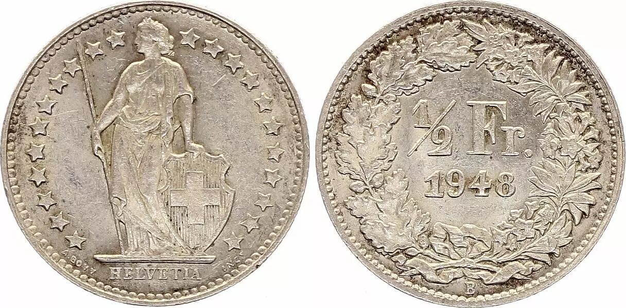 Coin Switzerland 1/2 Franc Helvetia - 1948 - B Bern - Silver