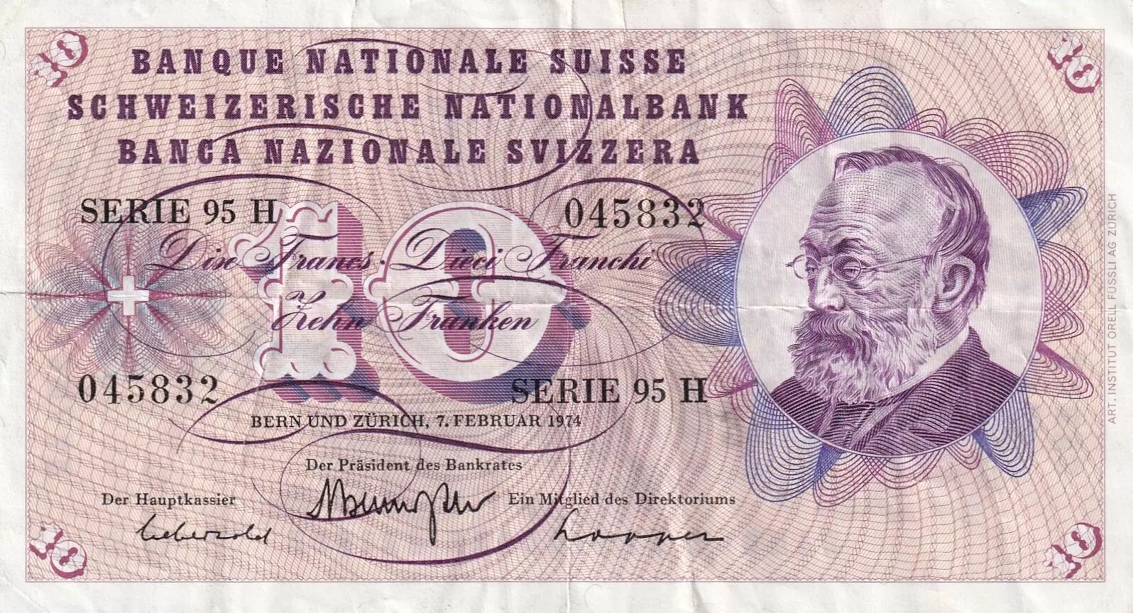 Banknote Switzerland 10 Francs 1967 - Gottfried Keller, Carnation Flowers - 07-02-1974 - Serial 95H
