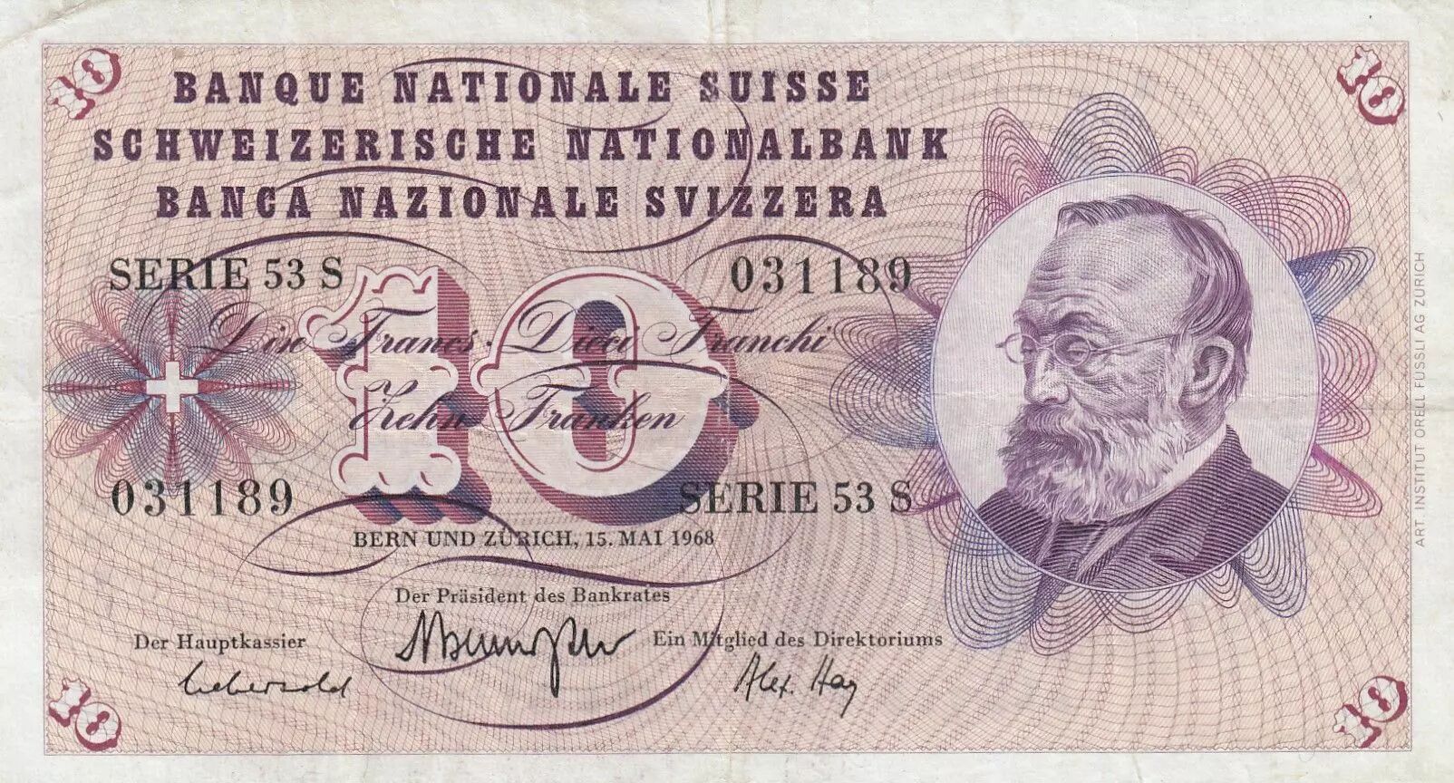 Home > World Banknotes > European Banknotes > Switzerland - Swiss Cantons > Switzerland > Switzerland 10 Francs - Gottfried Keller - Carnation Flowers - 15-05-1968 - Serial 53S