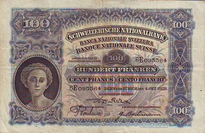 Home > World Banknotes > European Banknotes > Switzerland - Swiss Cantons > Switzerland > Switzerland 100 Francs 1928 - Woman's head, peasant