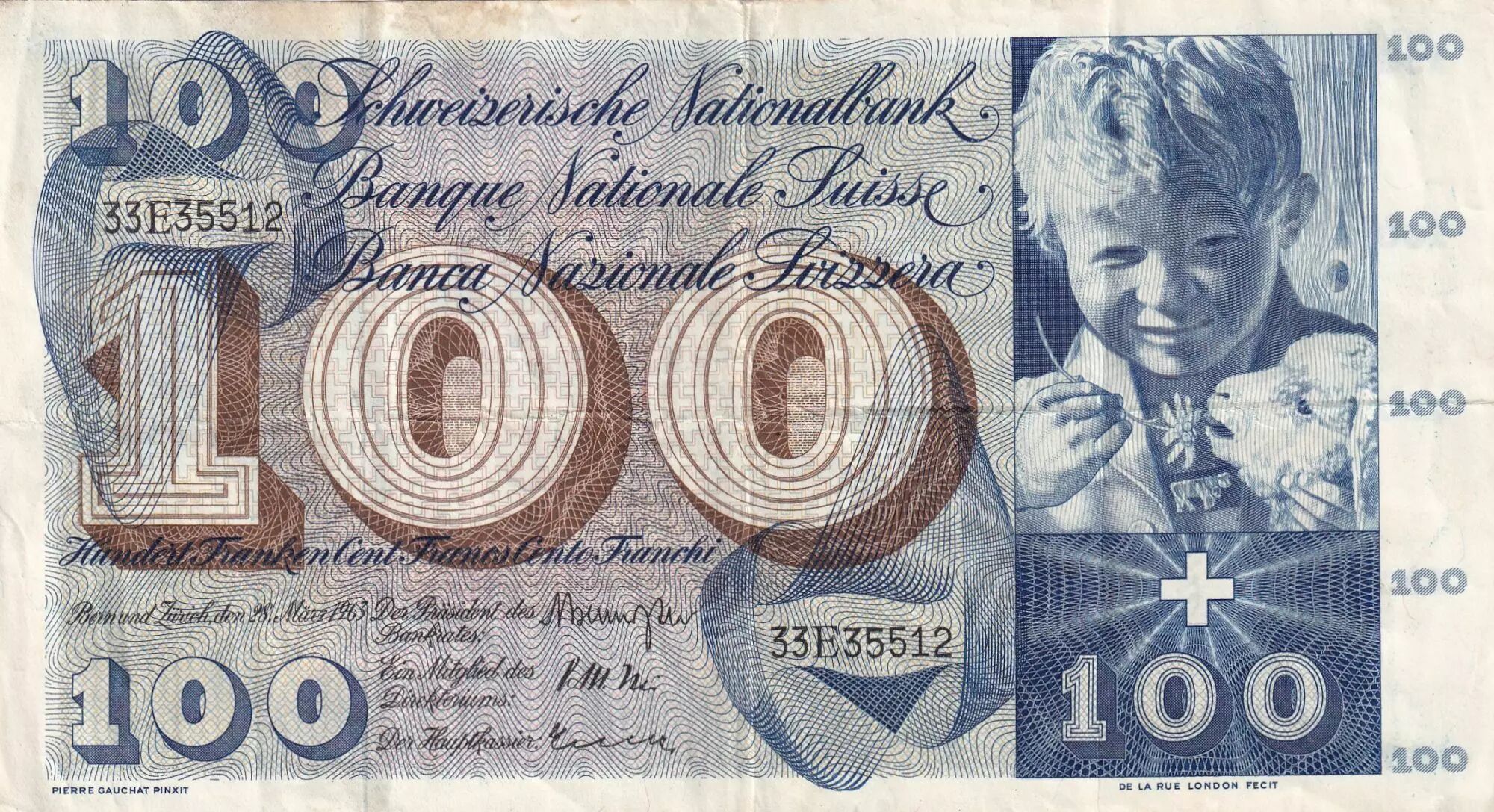 Home > > Switzerland 100 Francs Child St Martin - 28-03-1963 - Serial 33E