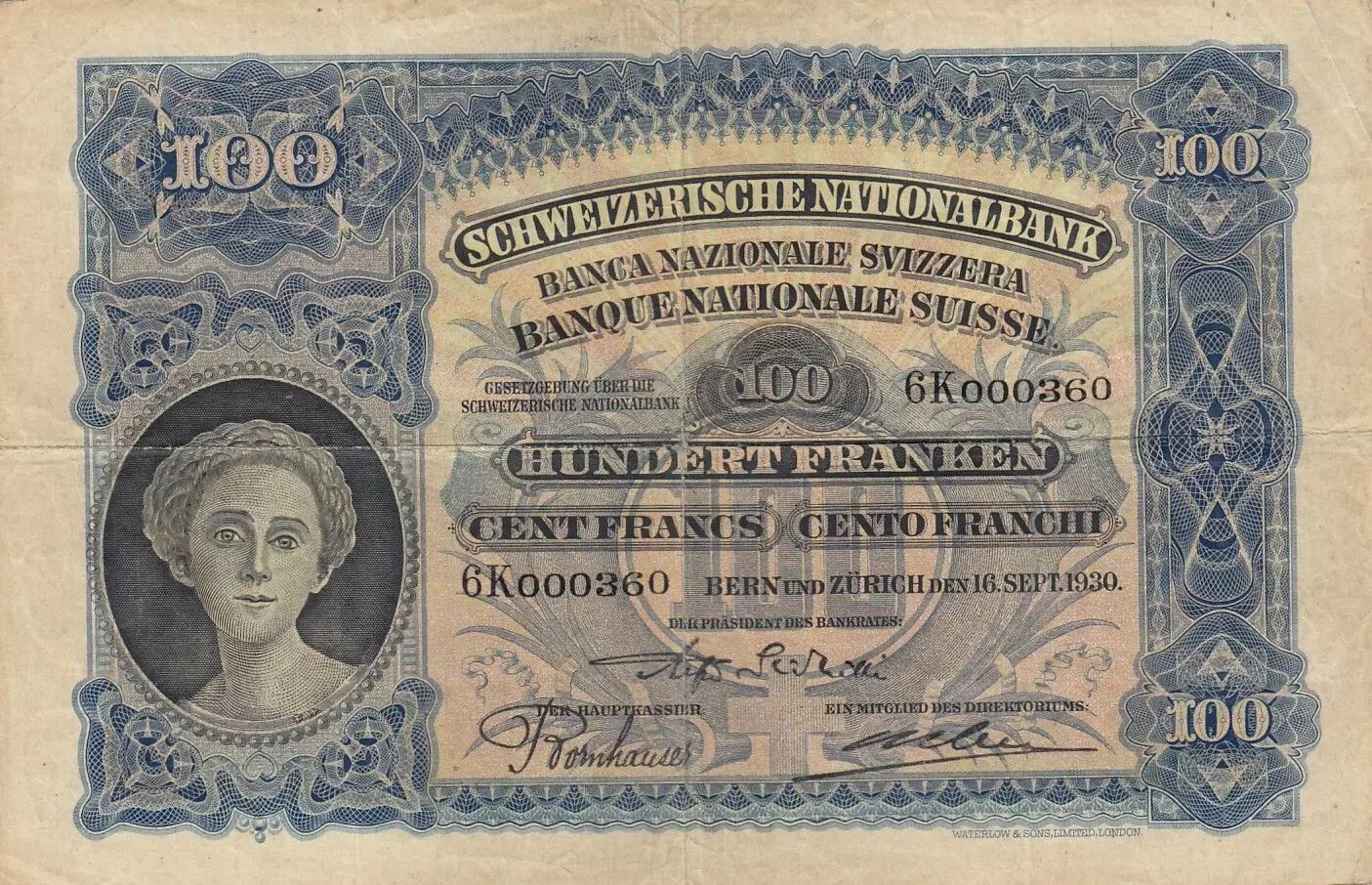 Home > World Banknotes > European Banknotes > Switzerland - Swiss Cantons > Switzerland > Switzerland 100 Francs Head of woman - Farmer - 16-09-1930 - Serial 6K