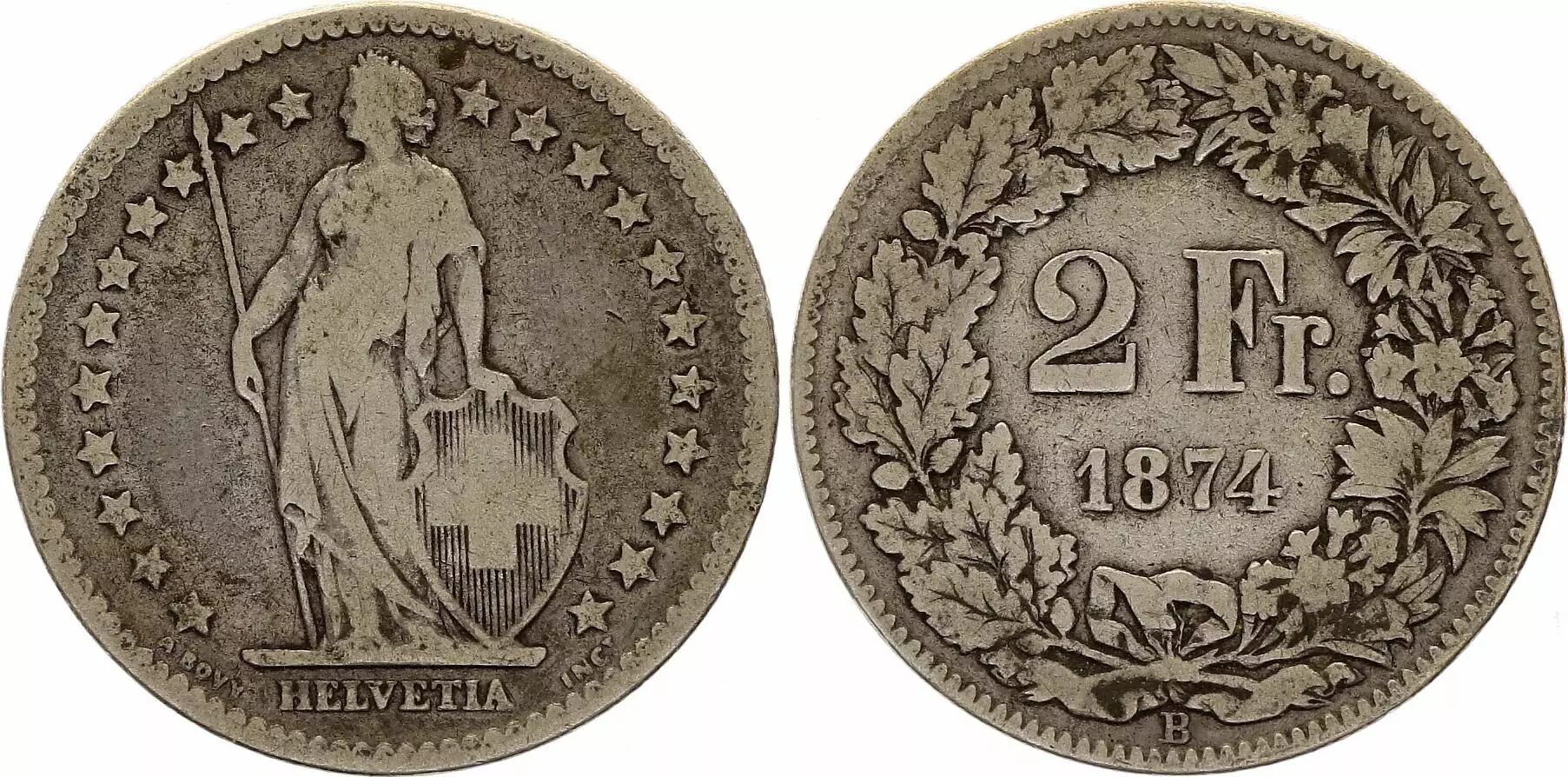 Coin Switzerland 2 Francs Helvetia - 1874 - B Bern - Silver