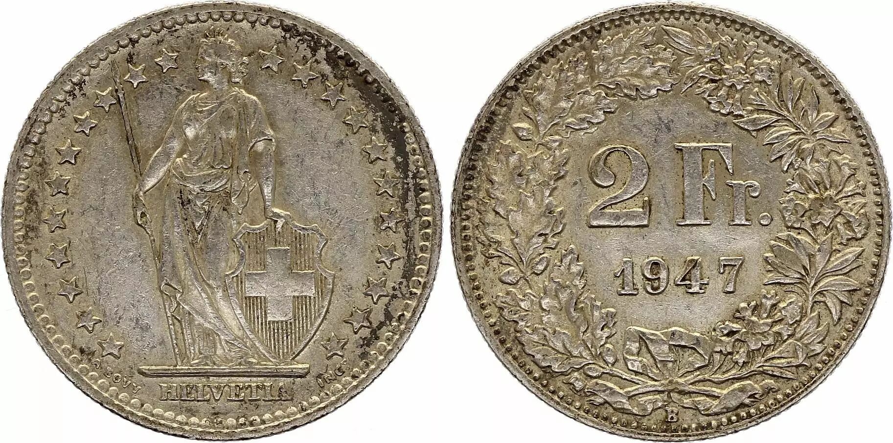 Coin Switzerland 2 Francs Helvetia - 1947 - B Bern - Silver