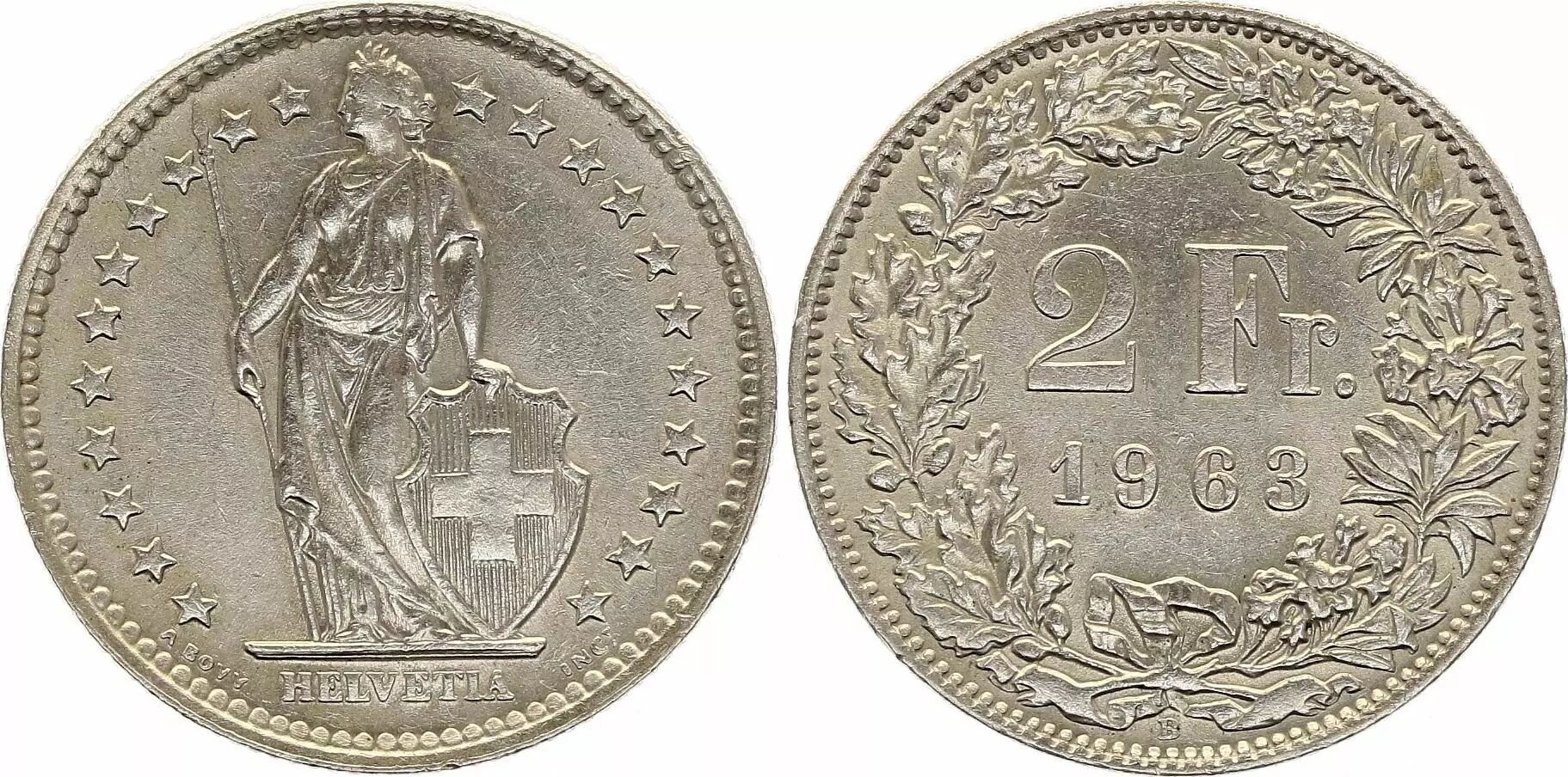 Coin Switzerland 2 Francs Helvetia - 1963 - B Bern - Silver