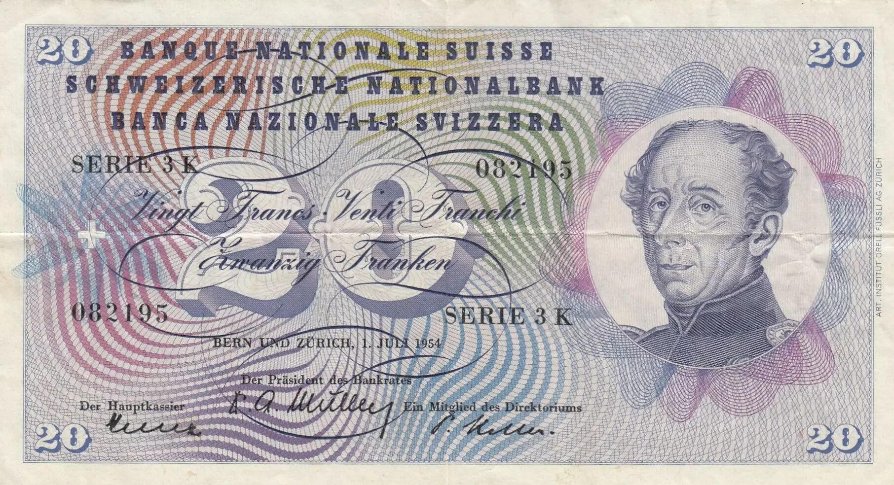 Banknote Switzerland 20 Francs - Guillaume-Henri Dufour - Silver thistle - 01-07-1954 - Serial 3K