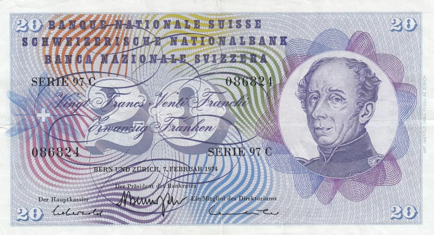 Banknote Switzerland 20 Francs - Guillaume-Henri Dufour - Silver thistle - 07-02-1974 - Serial 97C