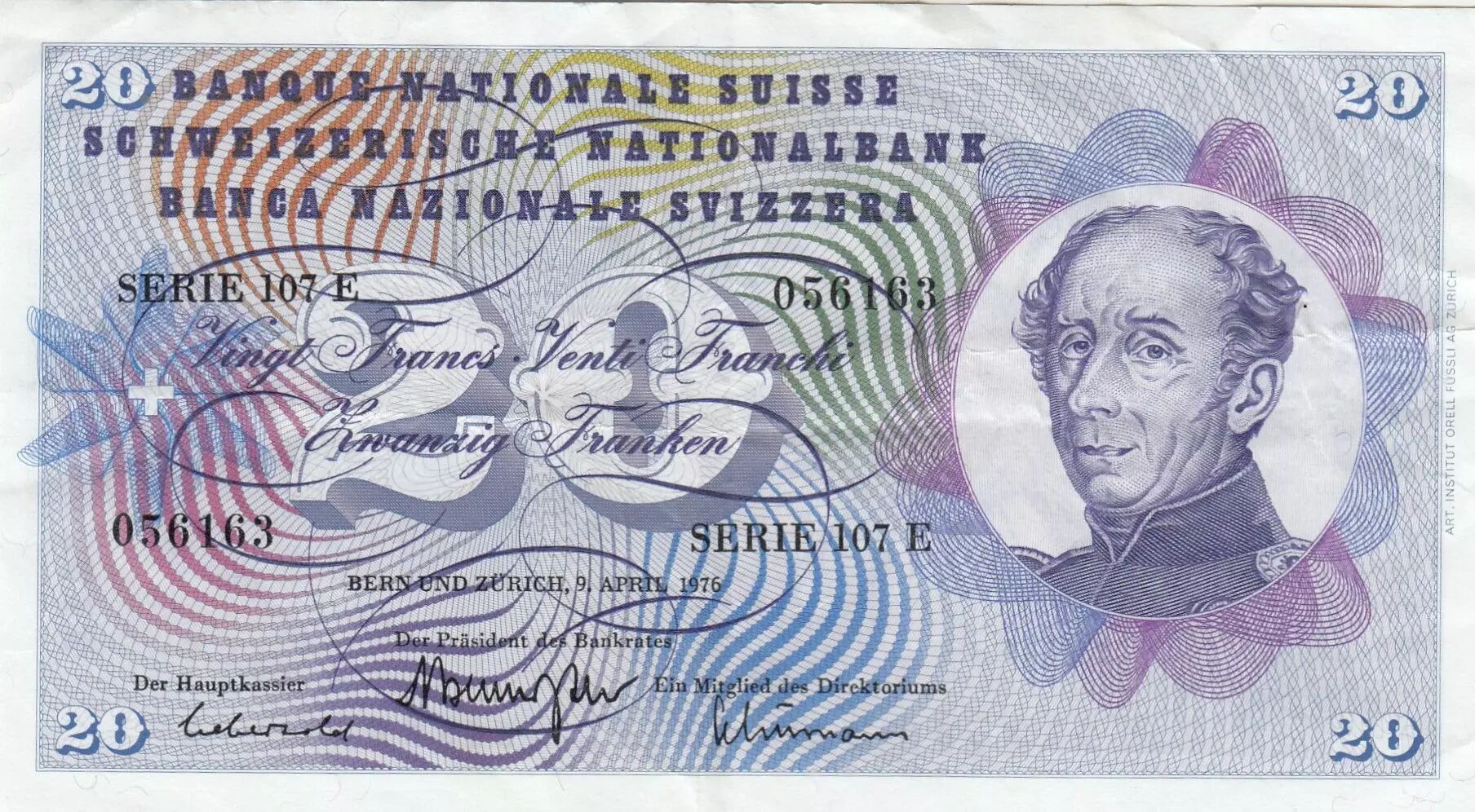 Banknote Switzerland 20 Francs - Guillaume-Henri Dufour - Silver thistle - 09-04-1976 - Serial 107E