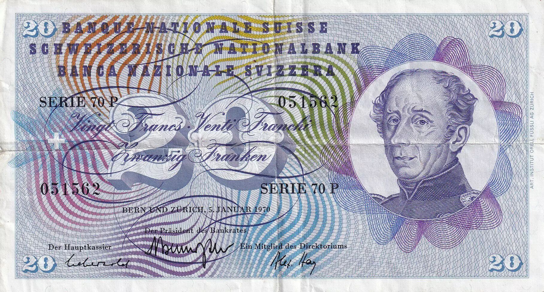 Home > World Banknotes > European Banknotes > Switzerland - Swiss Cantons > Switzerland > Switzerland 20 Francs - Guillaume-Henri Dufour - Silver thistle - 1970 - P.46r