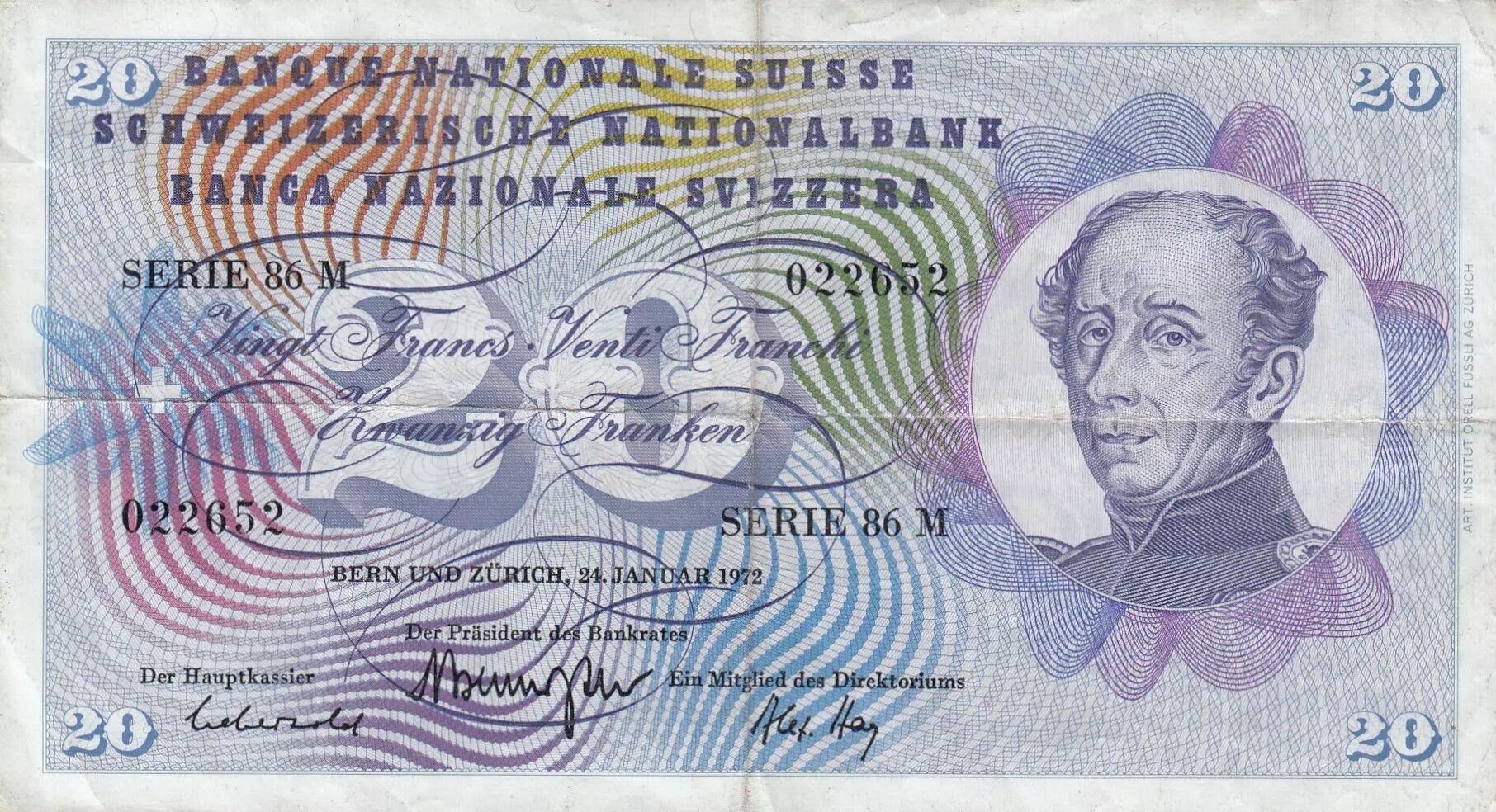 Banknote Switzerland 20 Francs, Guillaume-Henri Dufour, silver thistle - 1972 - F - P.46t - Serial 86 M