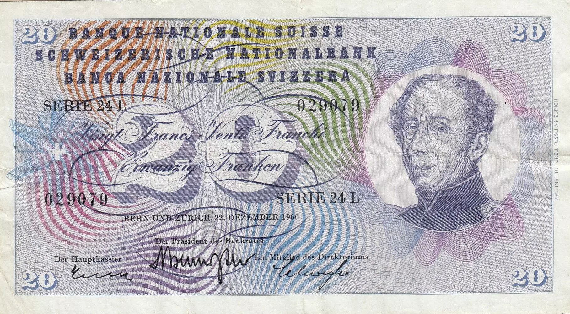 Home > World Banknotes > European Banknotes > Switzerland - Swiss Cantons > Switzerland > Switzerland 20 Francs - Guillaume-Henri Dufour - Silver thistle - 22-12-1960 - Serial 24L