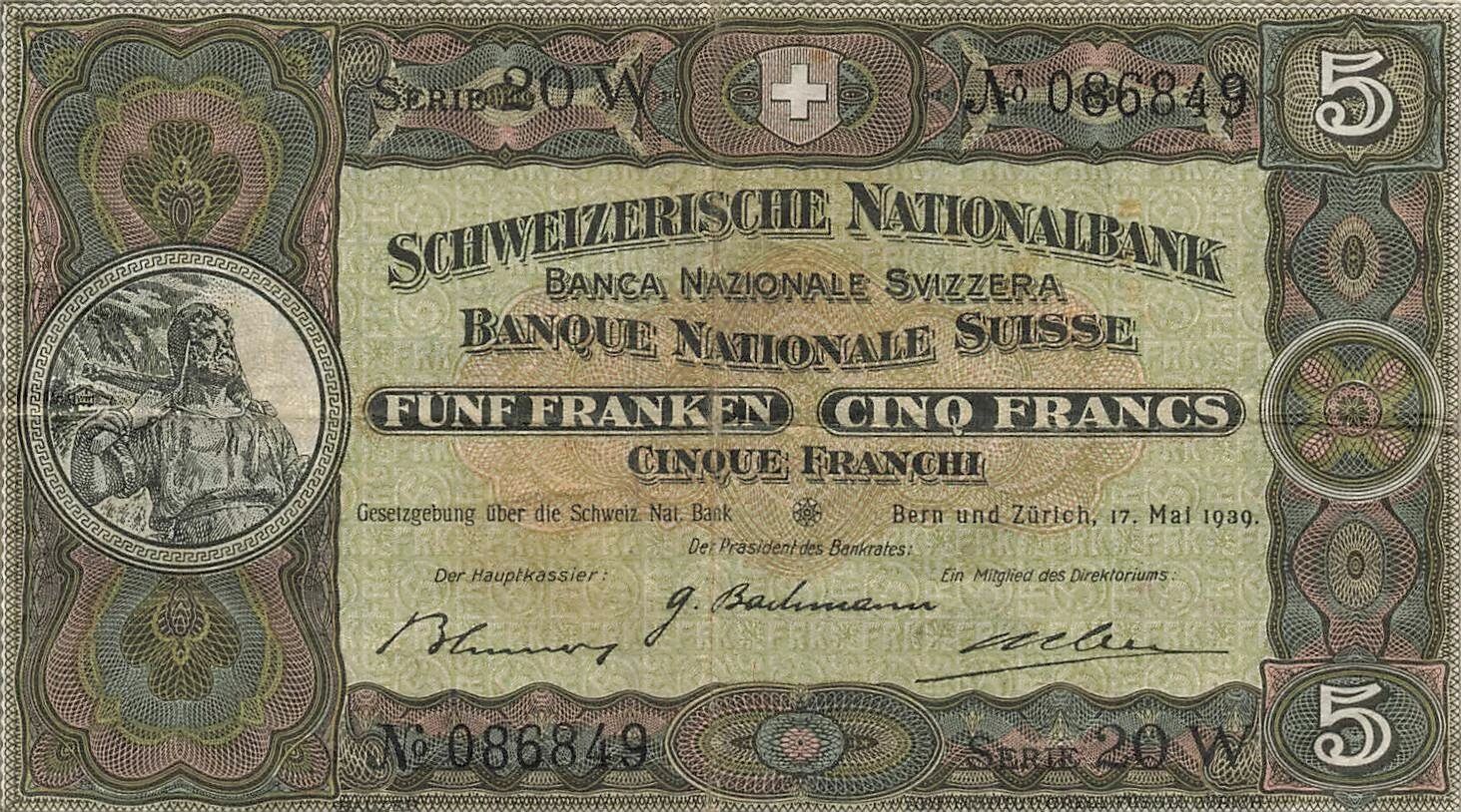 Banknote Switzerland 5 Francs - 17-05-1939 - P.11i