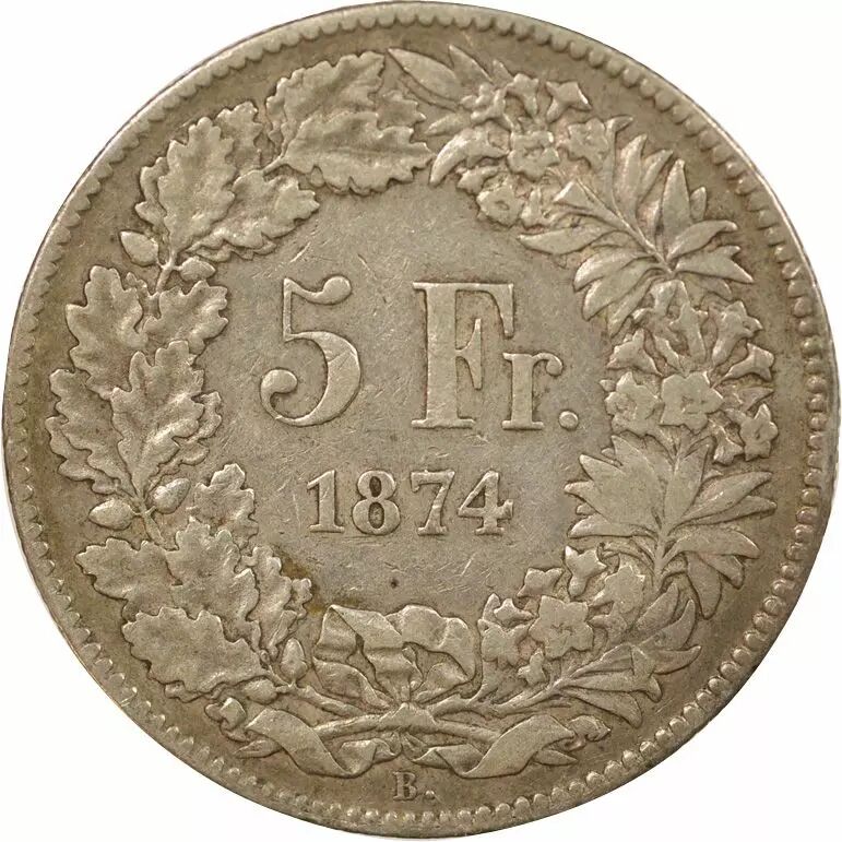 Coin Switzerland 5 Silver Francs, Seated Helvetia - 1874 B. Bruxelles