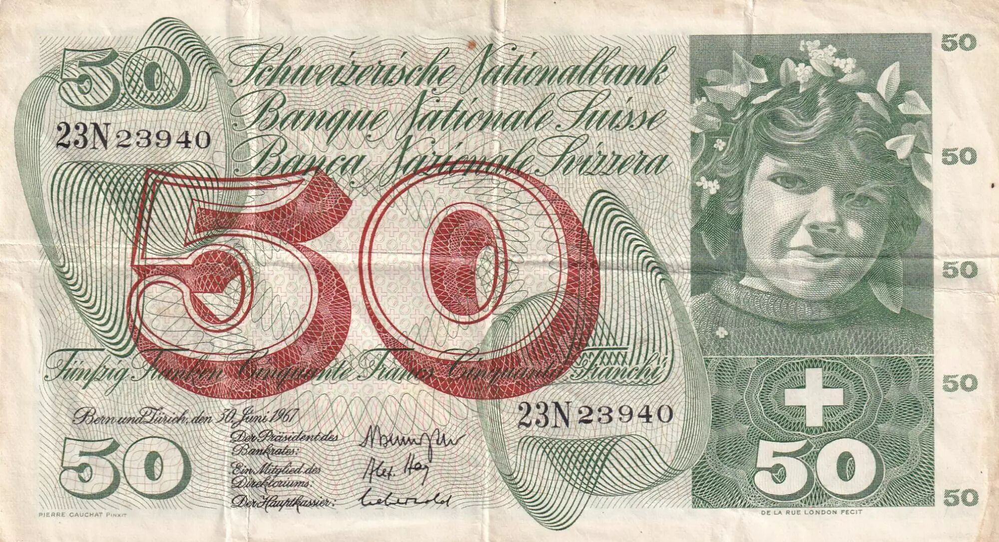 Banknote Switzerland 50 Francs - Apple Harvesting Scene - 30-06-1967 - Serial 23N