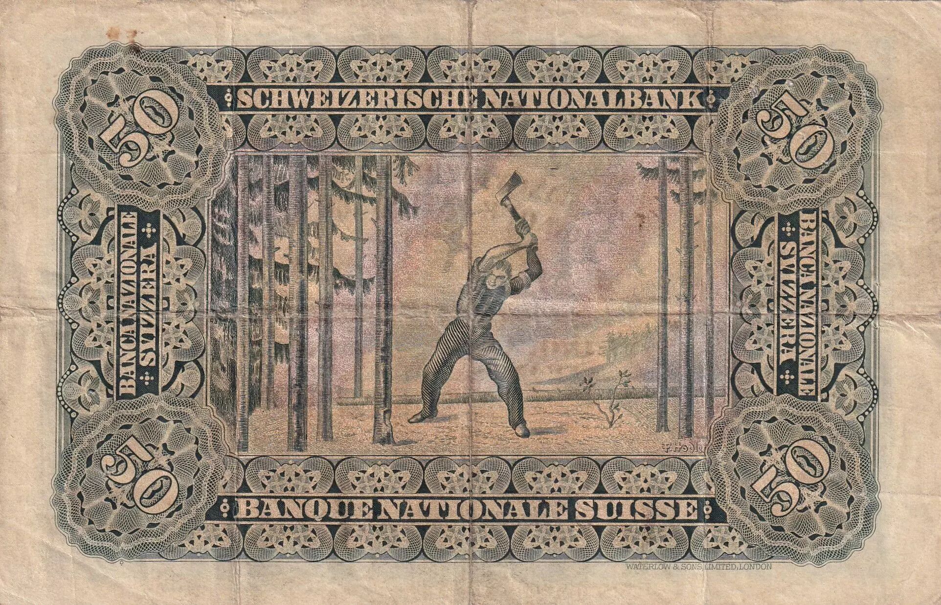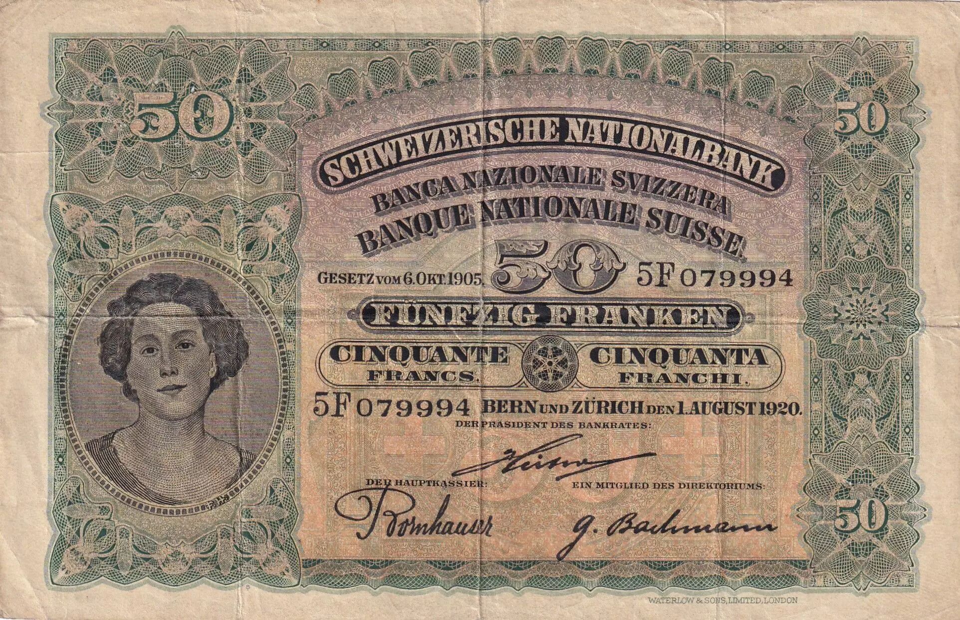 Banknote Switzerland 50 Francs Woman's head - 01-08-1920 - Serial 5F