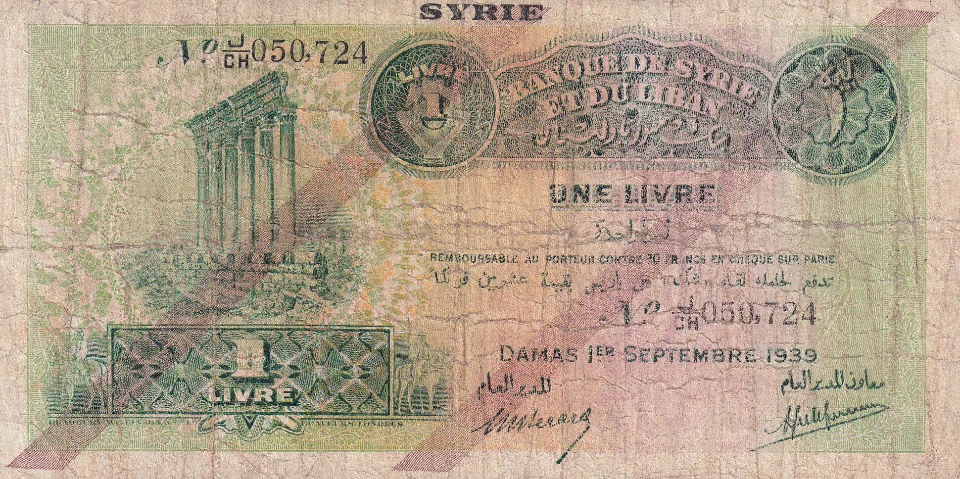 Banknote Syrian Arab Republic 1 Livre - Syria - Baalbek - 1939 - Serial J.CH - P.40