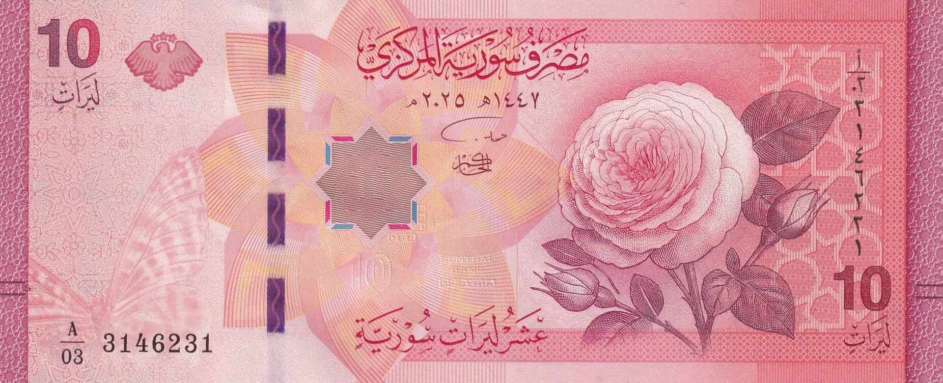 This banknote is issued by the Central Bank of Syria. It was put into circulation in 2025 and has a face value of 10 pounds.