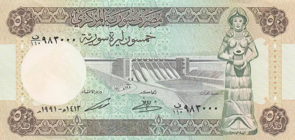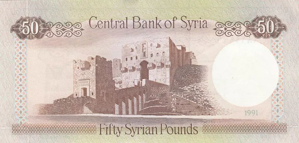 Banknote Syrian Arab Republic 50 Pounds Dam - Citadel of Aleppo - 1991