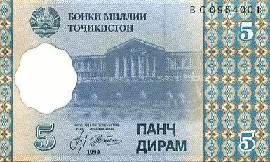 Accueil > Billets du Monde > Billets d'Asie > Tadjikistan > Tadjikistan 5 Dirams 1999 - Palais de la Culture - Tombeau de M. Tursunzoda