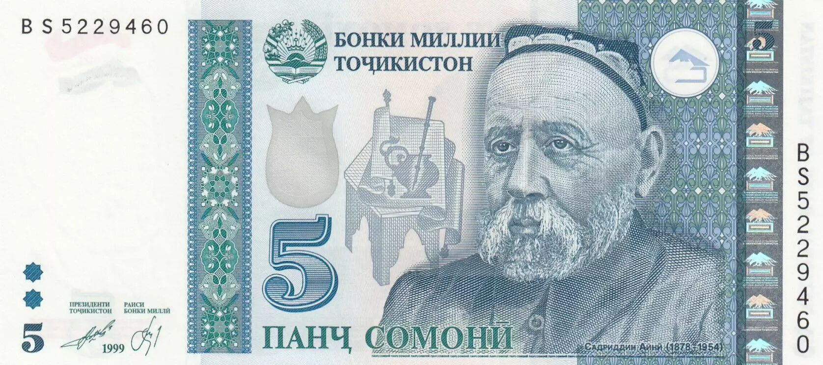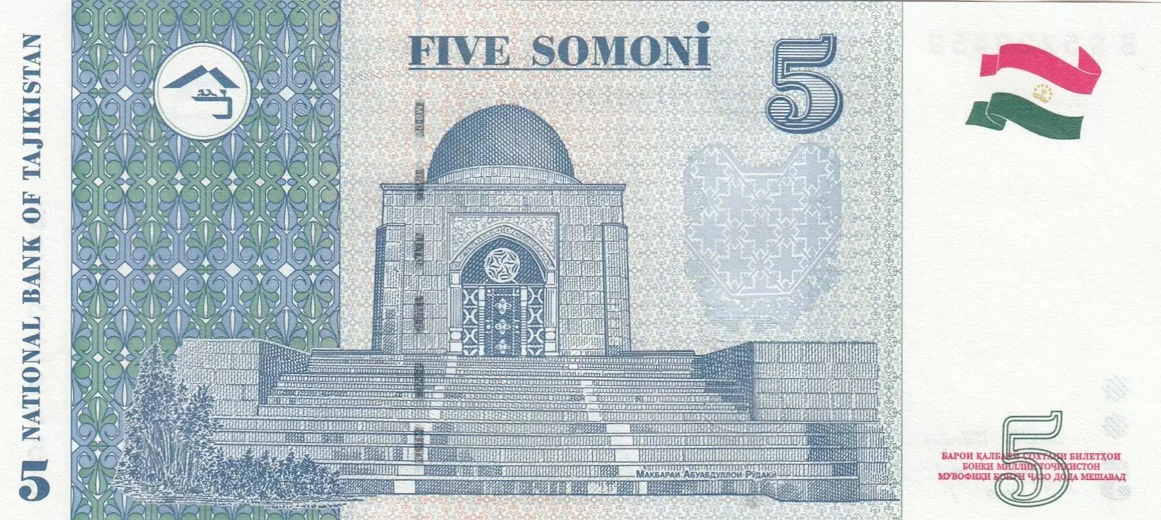 Billet Tadjikistan 5 Somoni - S. Ayni - Tombeau de A. Rudaki - 1999