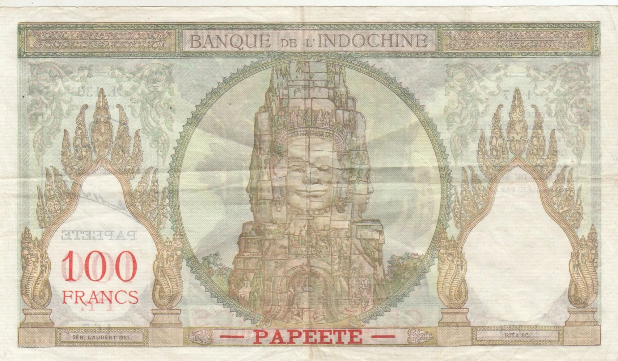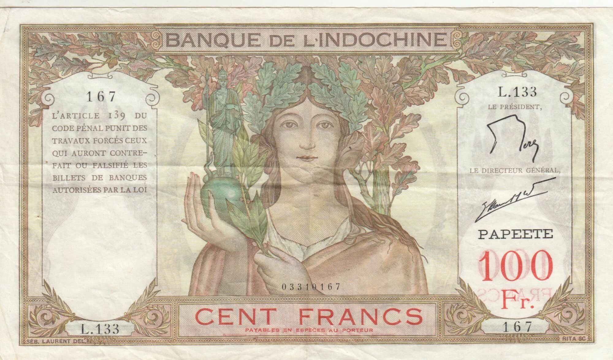 This Tahitian banknote has a face value of 100 francs. It was issued between 1937 and 1965. Its dimensions are 206 millimeters in length and 118 millimeters in width.