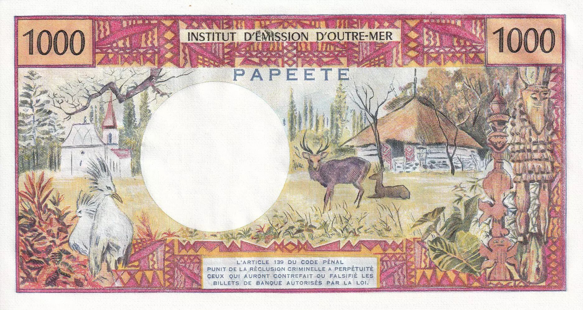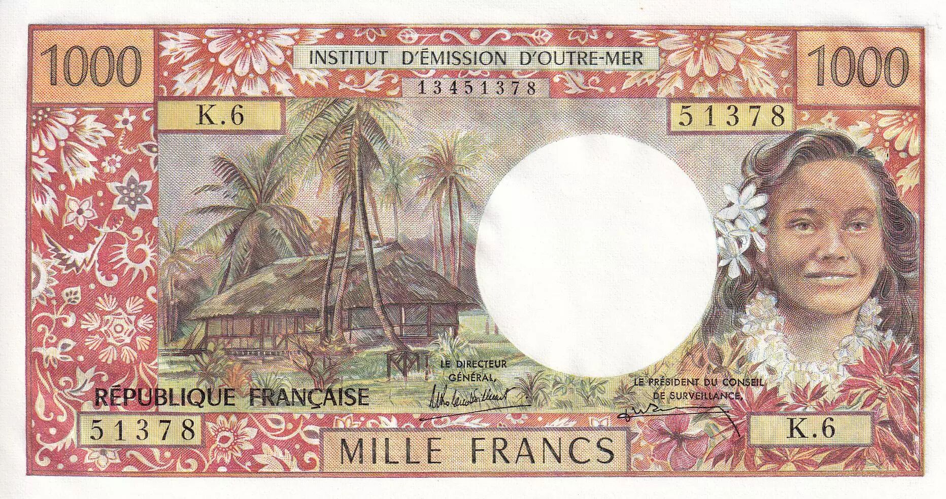 Banknote Tahiti 1000 Francs Tahitian woman - Hut in palm trees - 1985 - K.6 - PUNC - P.27d