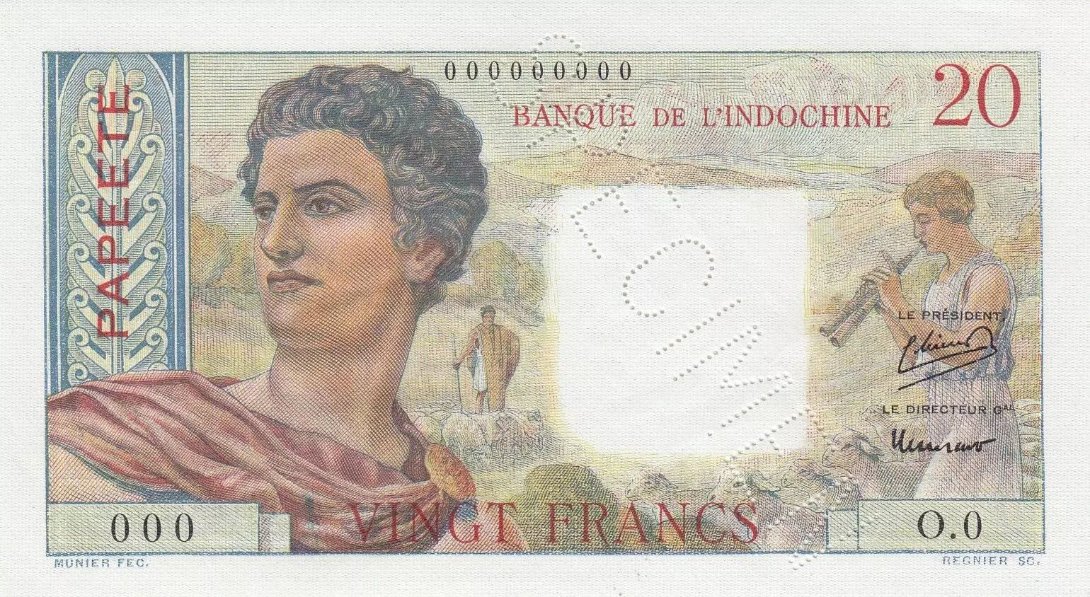 Accueil > Archivage > Tahiti 20 Francs Jeune Berger - ND (1951) - Spécimen