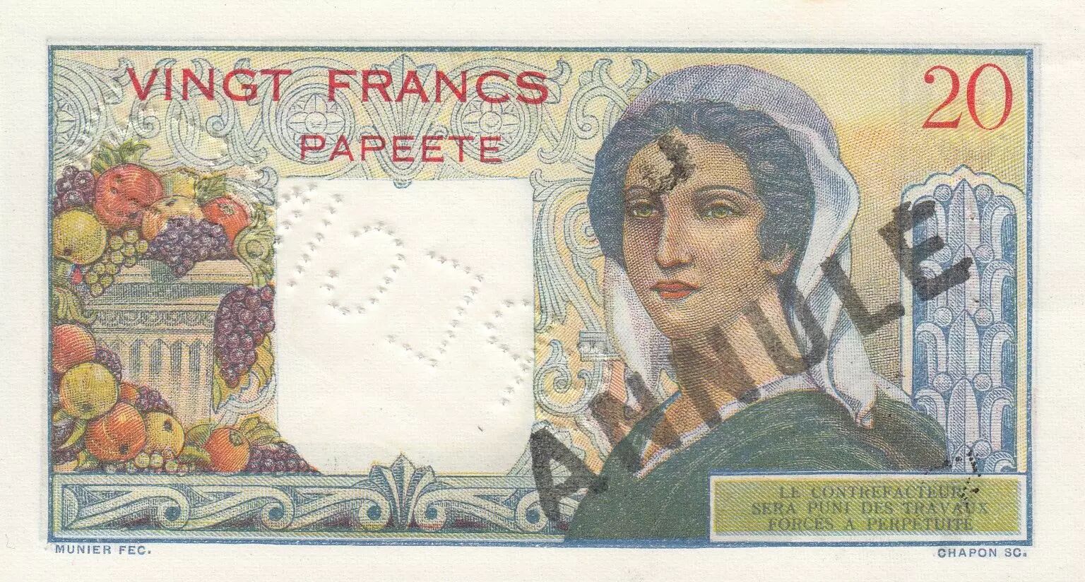 Accueil > Archivage > Tahiti 20 Francs Jeune Berger - ND (1954) - Spécimen sur billet Série U.28